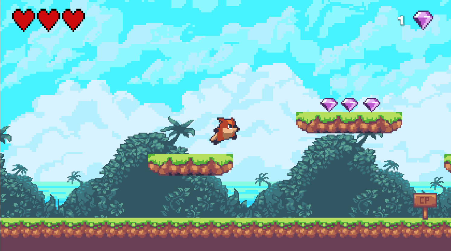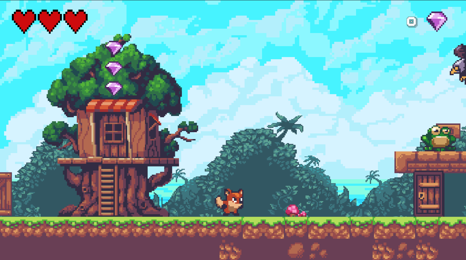 - Currently there are 4 types of enemies. Jumping frog, flying eagle, opposum and a tank boss. Each enemy hit lowers the hp equally except the boss, which lowers more hp by firing bullets frequently.